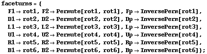 Those moves can be expressed in terms of face turns. For simplicity, we use an external solver to do it (we use kociemba.org). This function transforms a permutation into a chain of facelets that can be fed to that solver: