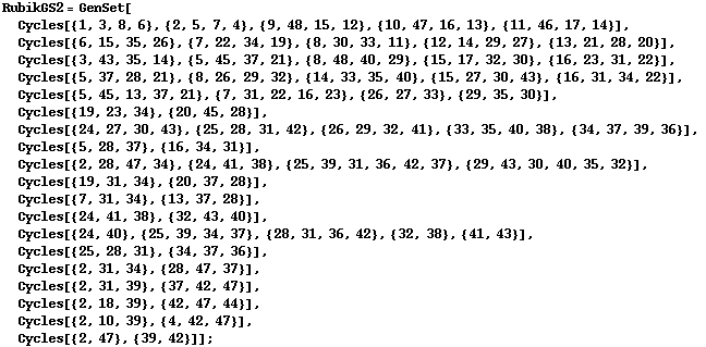 We translate it to Cycles notation. We see that there are 18 points in the base and 99 generators (a SGS with only 19 generators is known for the Rubik's group):