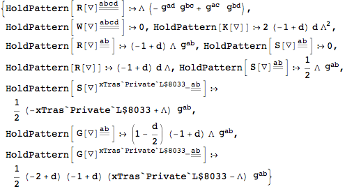| SymmetricSpaceRules[cd,K] | produces replacement rules for the curvature tensors of the covariant derivative cd on a symmetric space of constant curvature K |