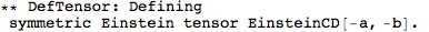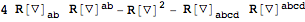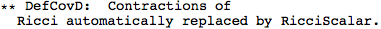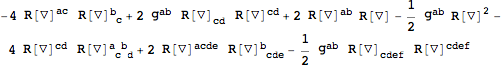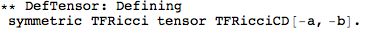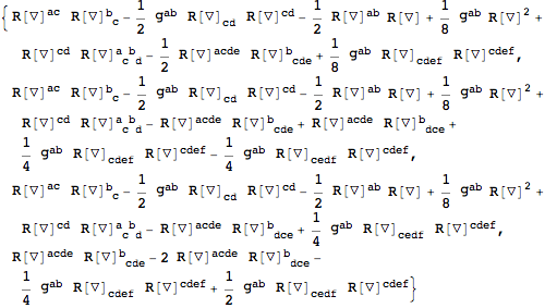 | FullSimplification[][expr] | tries to simplify expr as much as possible, taking Bianchi identities into account and sorting covariant derivatives. |